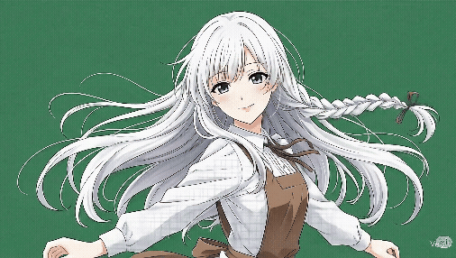 헤어스타일: 찰랑거리는 흰색의 긴 머리카락이 어깨 너머로 부드럽게 흘러내리고 있습니다. 앞머리는 자연스럽게 이마를 덮고 있으며, 옆머리 일부는 땋아서 뒤로 넘긴 듯한 섬세한 스타일링이 돋보입니다. 햇빛을 받아 머리카락의 윤기가 더욱 부드럽고 아름답게 표현되었습니다.